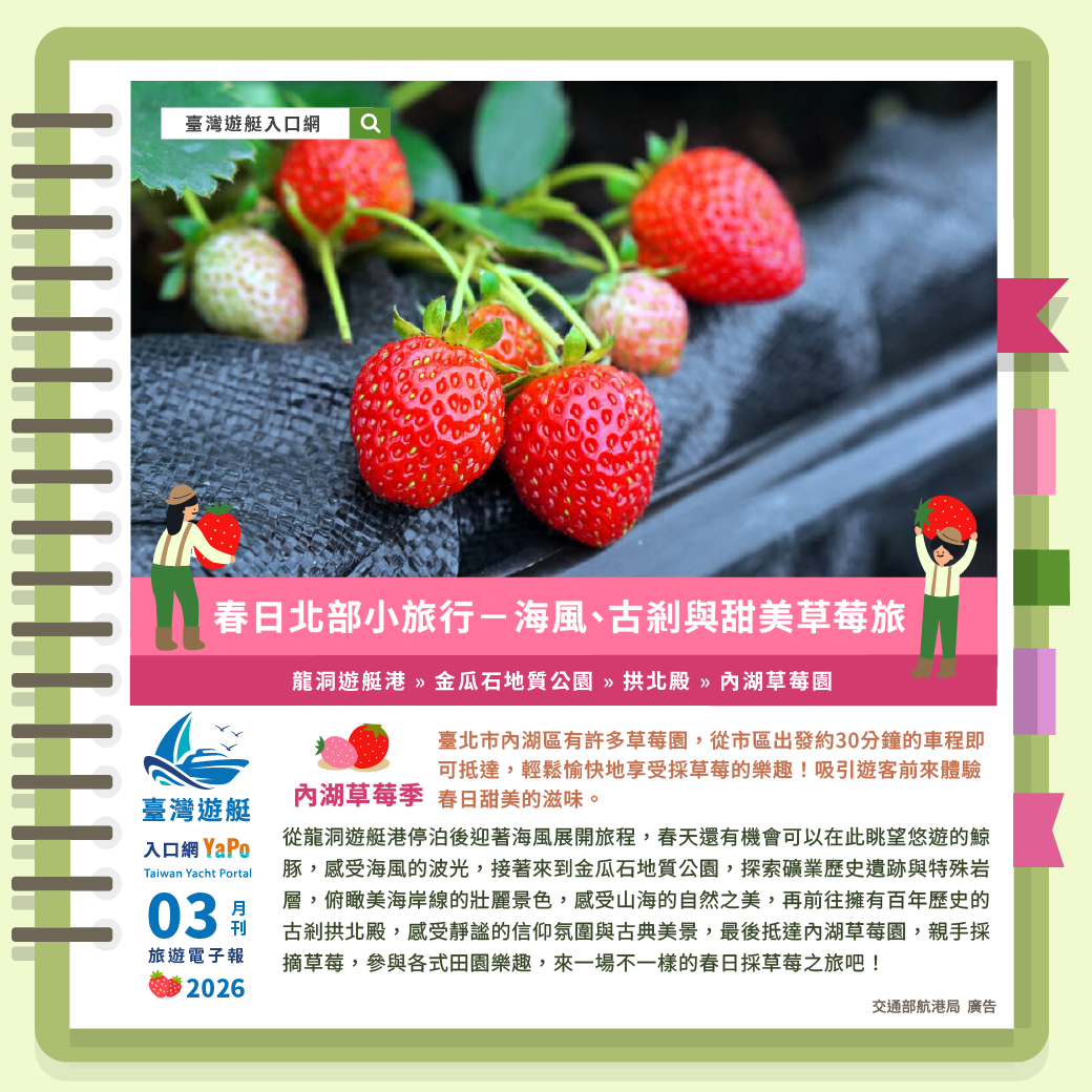 從龍洞遊艇港停泊後迎著海風展開旅程,春天還有機會可以在此眺望悠遊的鯨豚,感受海風的波光,接著來到金瓜石地質公園,探索礦業歷史遺跡與特殊岩層,俯瞰美海岸線的壯麗景色,感受山海的自然之美,再前往擁有百年歷史的古剎拱北殿,感受靜謐的信仰氛圍與古典美景,最後抵達內湖草莓園,親手採摘草莓,參與各式田園樂趣,來一場不一樣的春日採草莓之旅吧!
