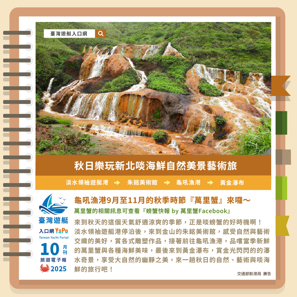 淡水領袖遊艇港停泊後,來到金山的朱銘美術館,感受自然與藝術交織的美好,賞各式雕塑作品,接著前往龜吼漁港,品嚐當季新鮮的萬里蟹與各種海鮮美味,最後來到黃金瀑布,賞金光閃閃的的瀑水奇景,享受大自然的幽靜之美,來一趟秋日的自然、藝術與啖海鮮的旅行吧!