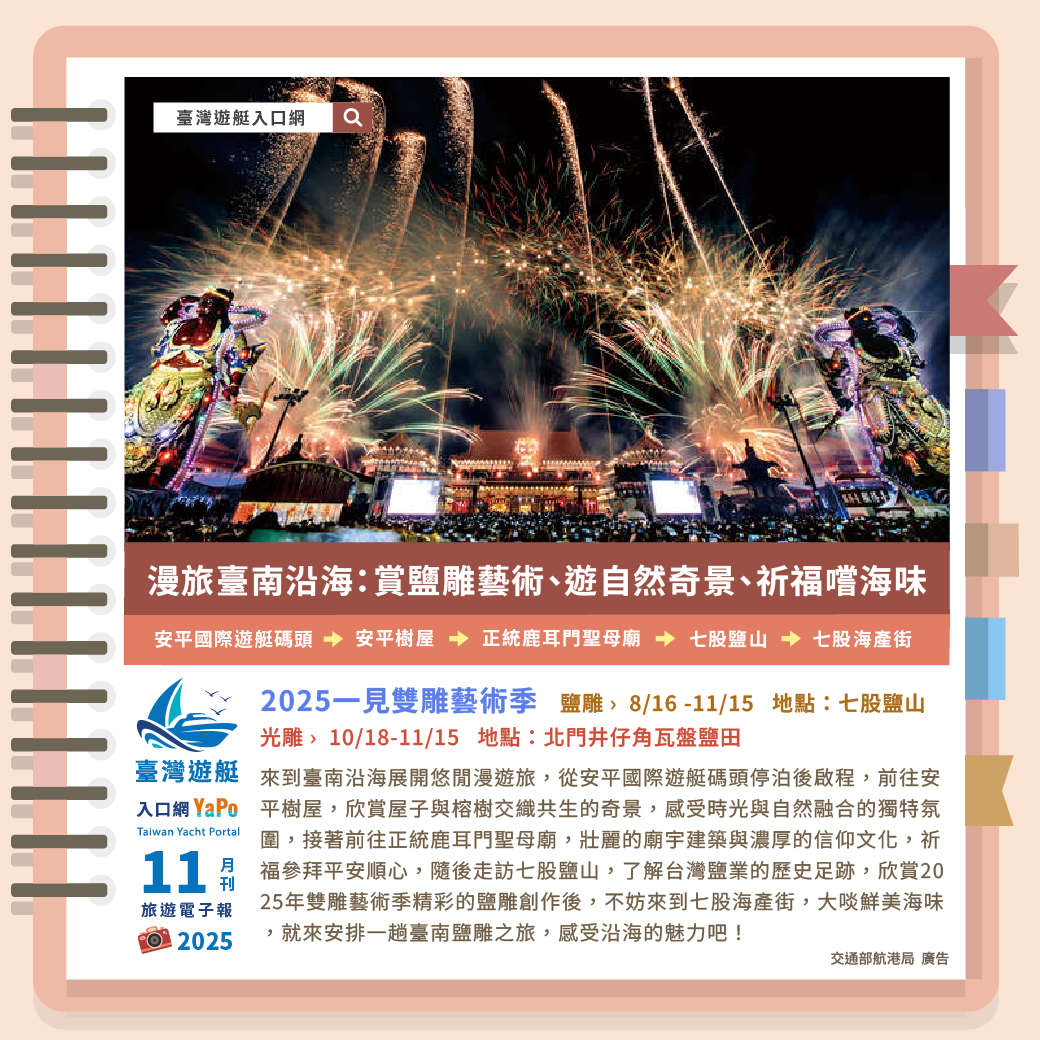 來到臺南沿海展開悠閒漫遊旅,從安平國際遊艇碼頭停泊後啟程,前往安平樹屋,欣賞屋子與榕樹交織共生的奇景,感受時光與自然融合的獨特氛圍,接著前往正統鹿耳門聖母廟,壯麗的廟宇建築與濃厚的信仰文化,祈福參拜平安順心,隨後走訪七股鹽山,了解台灣鹽業的歷史足跡,欣賞2025年雙雕藝術季精彩的鹽雕創作後,不妨來到七股海產街,大啖鮮美海味,就來安排一趟臺南鹽雕之旅,感受沿海的魅力吧!