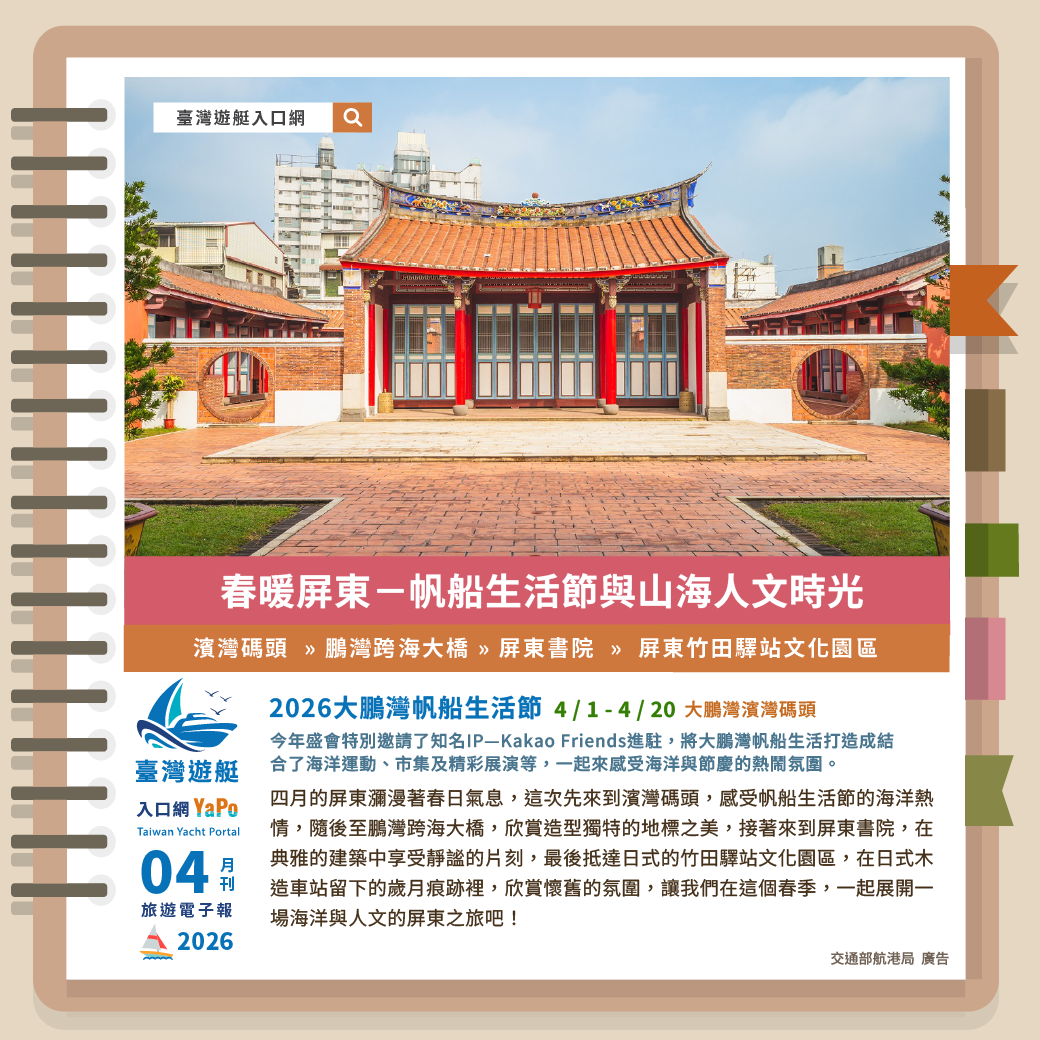 四月的屏東瀰漫著春日氣息,這次先來到濱灣碼頭,感受帆船生活節的海洋熱情,隨後至鵬灣跨海大橋,欣賞造型獨特的地標之美,接著來到屏東書院,在典雅的建築中享受靜謐的片刻,最後抵達日式的竹田驛站文化園區,在日式木造車站留下的歲月痕跡裡,欣賞懷舊的氛圍,讓我們在這個春季,一起展開一場海洋與人文的屏東之旅吧!