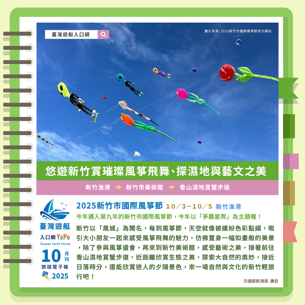 今年邁入第九年的新竹市國際風箏節,每到秋天便吸引眾多遊客前來觀賞這場視覺盛宴,今年以「爭霸星際」為主題,邀請來自4個國家、共12支國際頂尖風箏團隊,結合太空與宇宙元素的創意風箏,還有夜光風箏表演、大型的地景以及各式精彩互動表演,一起到新竹漁港,享受風箏飛舞繽紛時光。