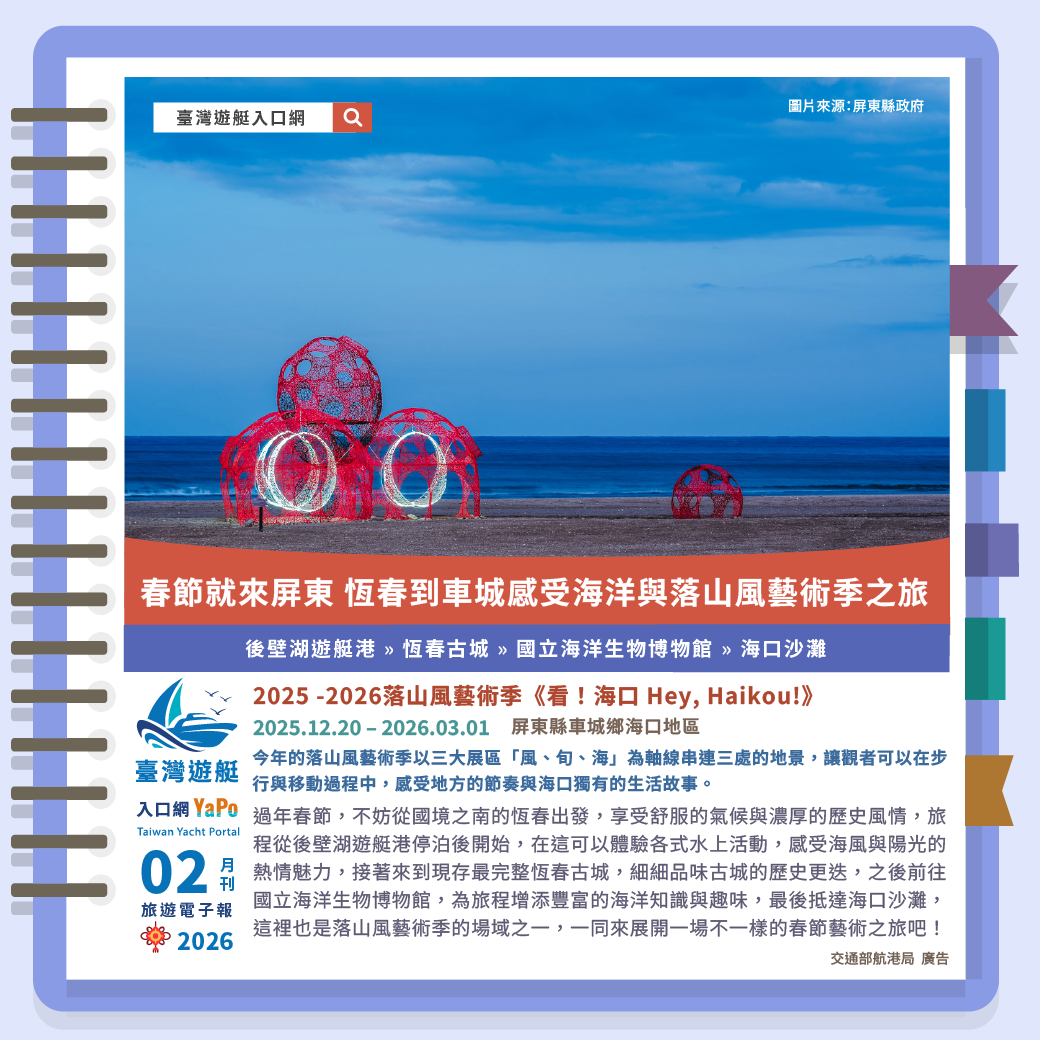 過年春節,不妨從國境之南的恆春出發,享受舒服的氣候與濃厚的歷史風情,旅程從後壁湖遊艇港停泊後開始,在這可以體驗各式水上活動,感受海風與陽光的熱情魅力,接著來到現存最完整恆春古城,細細品味古城的歷史更迭,之後前往國立海洋生物博物館,為旅程增添豐富的海洋知識與趣味,最後抵達海口沙灘,這裡也是落山風藝術季的場域之一,一同來展開一場不一樣的春節藝術之旅吧!