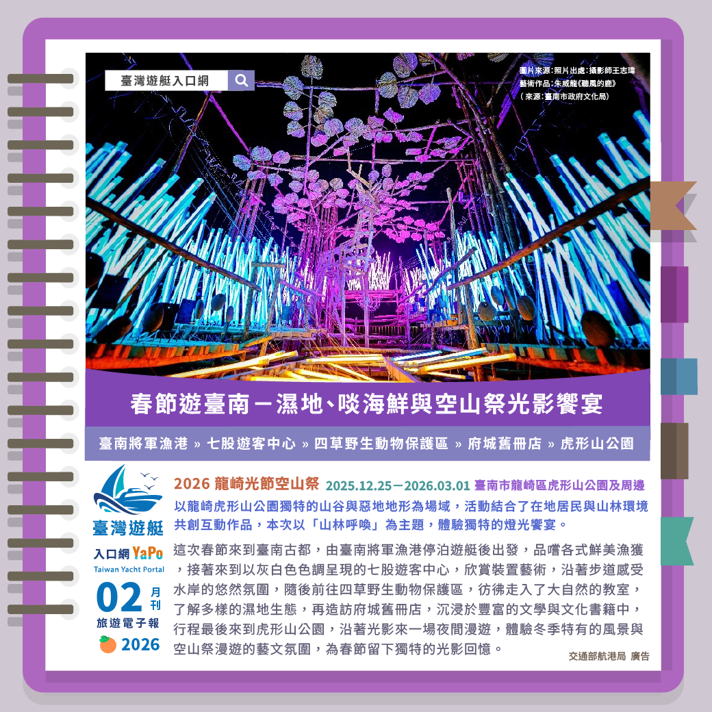 這次春節來到臺南古都,由臺南將軍漁港停泊遊艇後出發,品嚐各式鮮美漁獲,接著來到以灰白色色調呈現的七股遊客中心,欣賞裝置藝術,沿著步道感受水岸的悠然氛圍,隨後前往四草野生動物保護區,彷彿走入了大自然的教室,了解多樣的濕地生態,再造訪府城舊冊店,沉浸於豐富的文學與文化書籍中,行程最後來到虎形山公園,沿著光影來一場夜間漫遊,體驗冬季特有的風景與空山祭漫遊的藝文氛圍,為春節留下獨特的光影回憶。